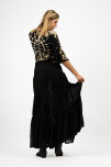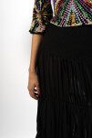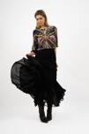La Falda Bohemia es una pieza larga, etérea y con un movimiento espectacular. Confeccionada en un tejido liviano con transparencias sutiles, crea un efecto fluido y elegante que acompaña cada paso. Su diseño en capas aporta volumen suave sin agregar peso, manteniendo una caída romántica y femenina.