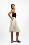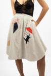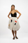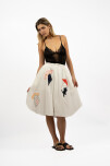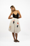Confeccionada en algodón liviano, esta falda midi de silueta amplia se destaca por sus apliques bordados a mano: un gato que se eleva con un sombrero, figuras geométricas y detalles coloridos que evocan movimiento y fantasía.