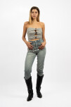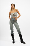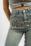 El Jean Libre redefine el clásico vaquero con una intervención artesanal de piedras, cristales y apliques metálicos que recorren el frente con brillo y textura.