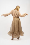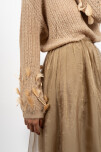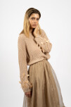 Su detalle protagonista está en las mangas: aplicaciones de plumas tono nude acompañadas por pequeñas cuentas brillantes que aportan movimiento, textura y un halo de luz único. Un gesto artesanal que transforma un sweater clásico en una pieza moderna, romántica y de autor.