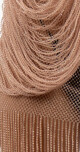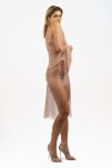El Vestido Serena está compuesto por dos piezas: un vestido al cuerpo confeccionado en red de cristales nude y una capa tipo saco del mismo material, que envuelve la silueta con caída etérea y flecos que acompañan cada movimiento.
